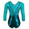 Justaucorps de gym victoire 01 vert métallisé à manches 3/4, décoré de strass brillants. Élégant, confortable et scintillant sur scène, il est idéal pour les compétitions et galas de gymnastique artistique ou rythmique.