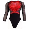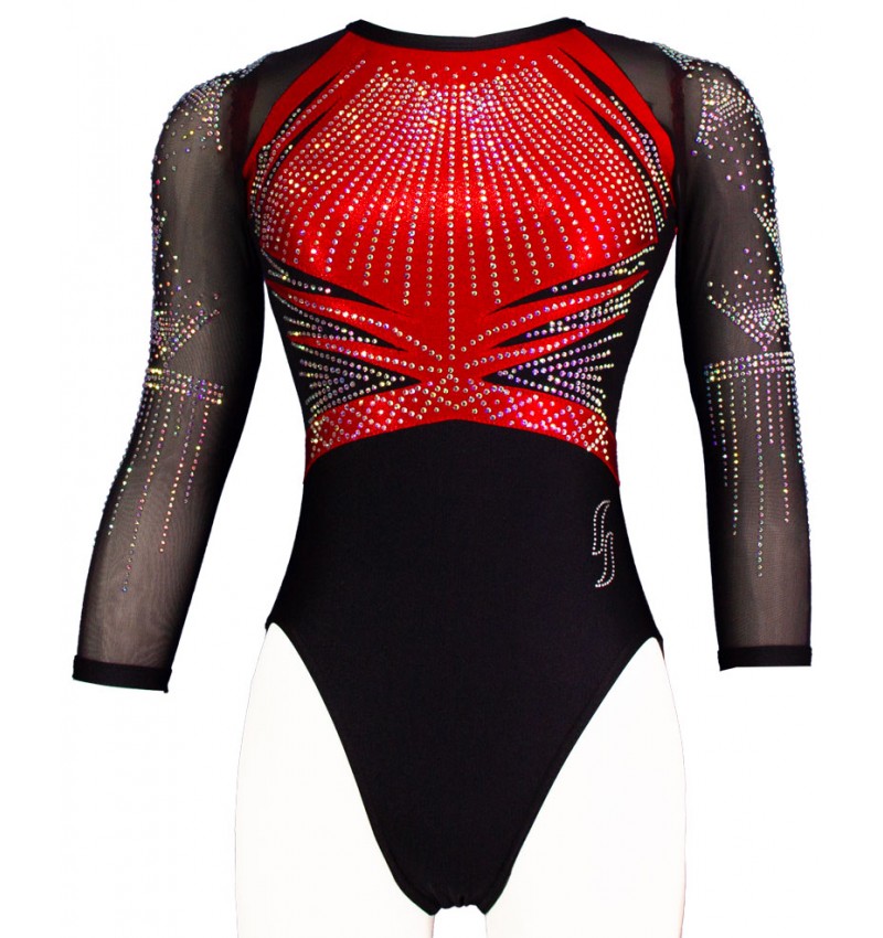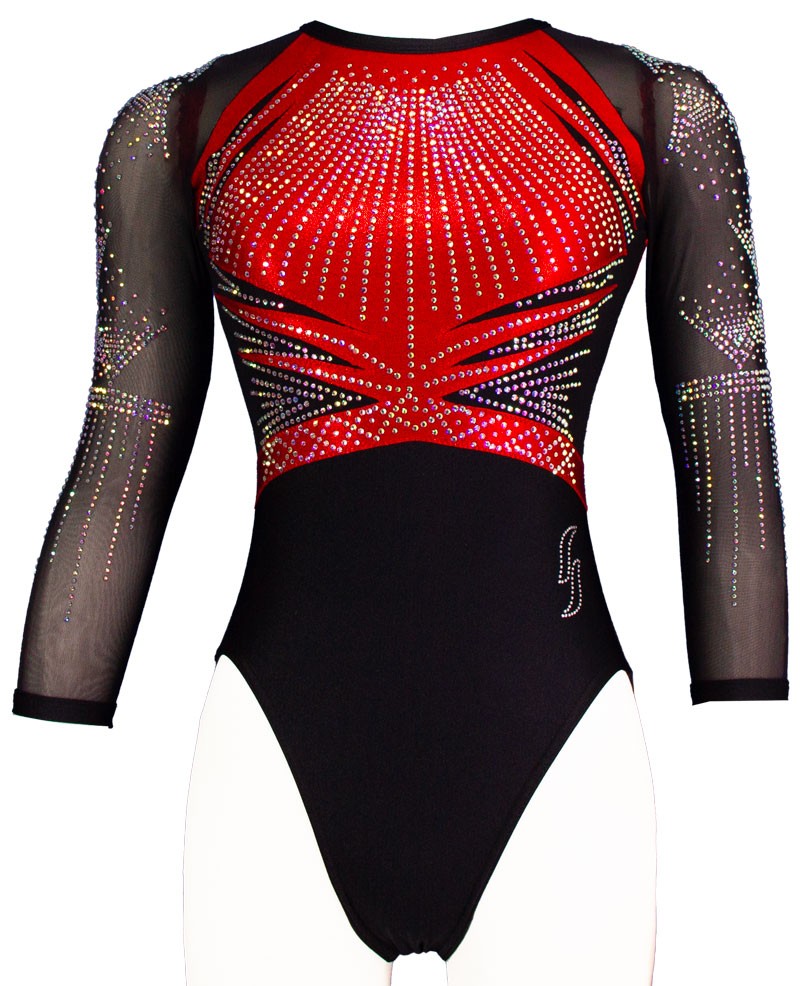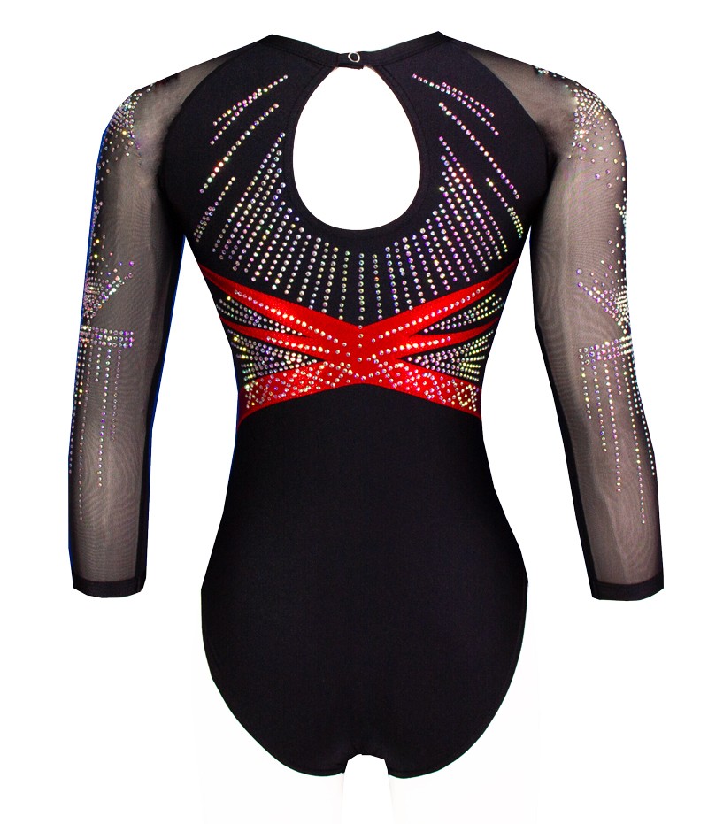 Élégant justaucorps de gym Toscane 04 noir et rouge, orné de strass scintillants. Ses manches 3/4 en voile transparent apportent style et confort. Parfait pour les compétitions, ce modèle allie performance et raffinement. Idéal pour les gymnastes recherchant une tenue professionnelle et élégante.